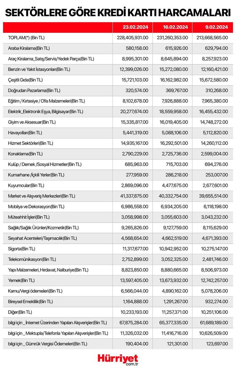 , kredi kartlarına ilişkin harcama detaylarını her hafta bir önceki haftanın verisini gecikmeli olarak açıklıyor. Kredi kartıyla harcamada liderlik internet üzerinden yapılan alışverişlerde olurken ikinci sırayı market ve alışveriş merkezlerinde yapılan harcamalar aldı. Üçüncü sıradaki harcama kaleminde ise elektrik-elektronik eşya-bilgisayar sektörü yer aldı.